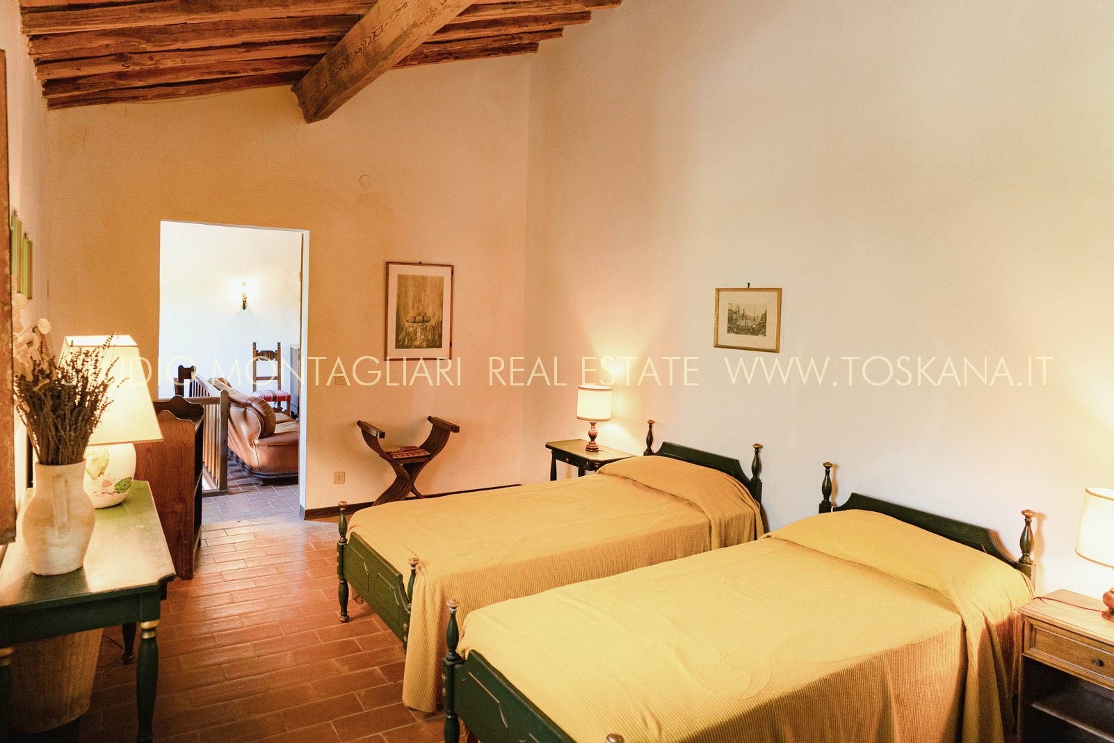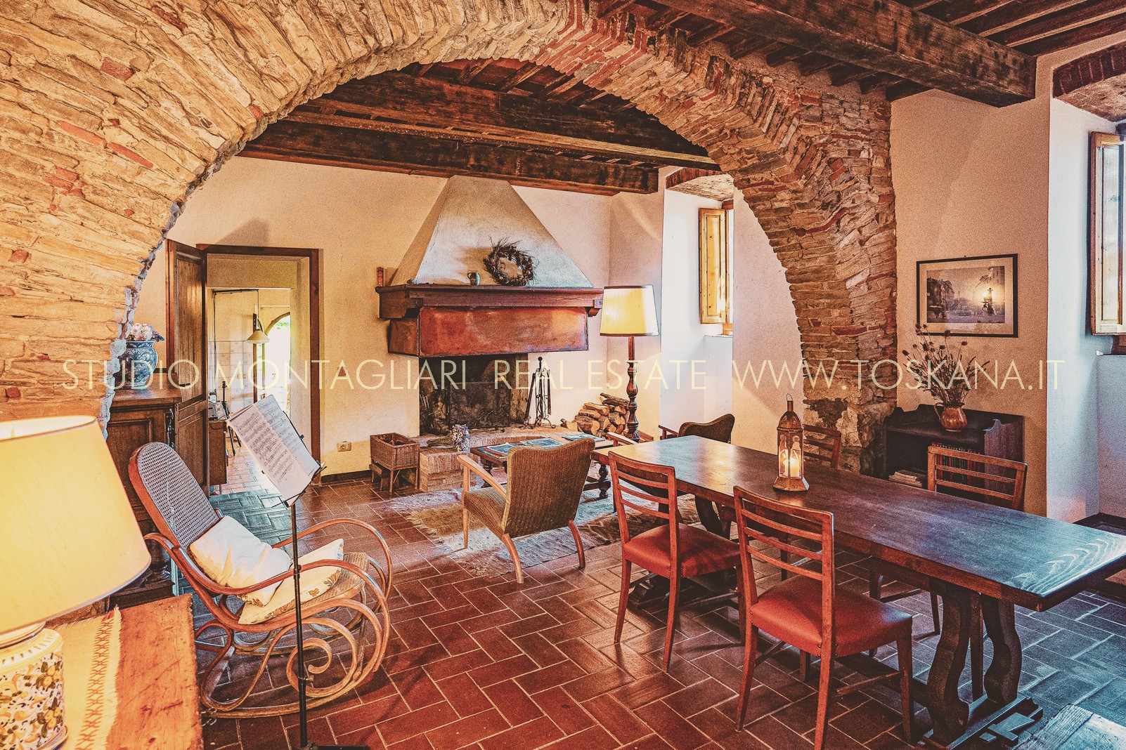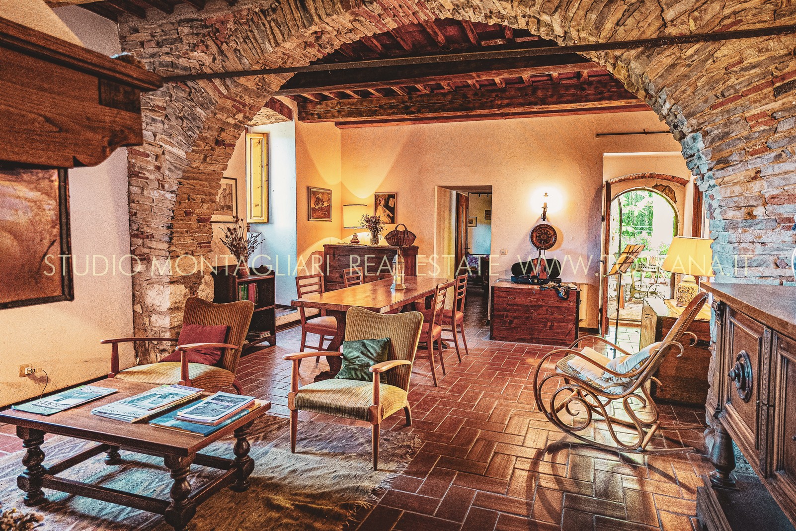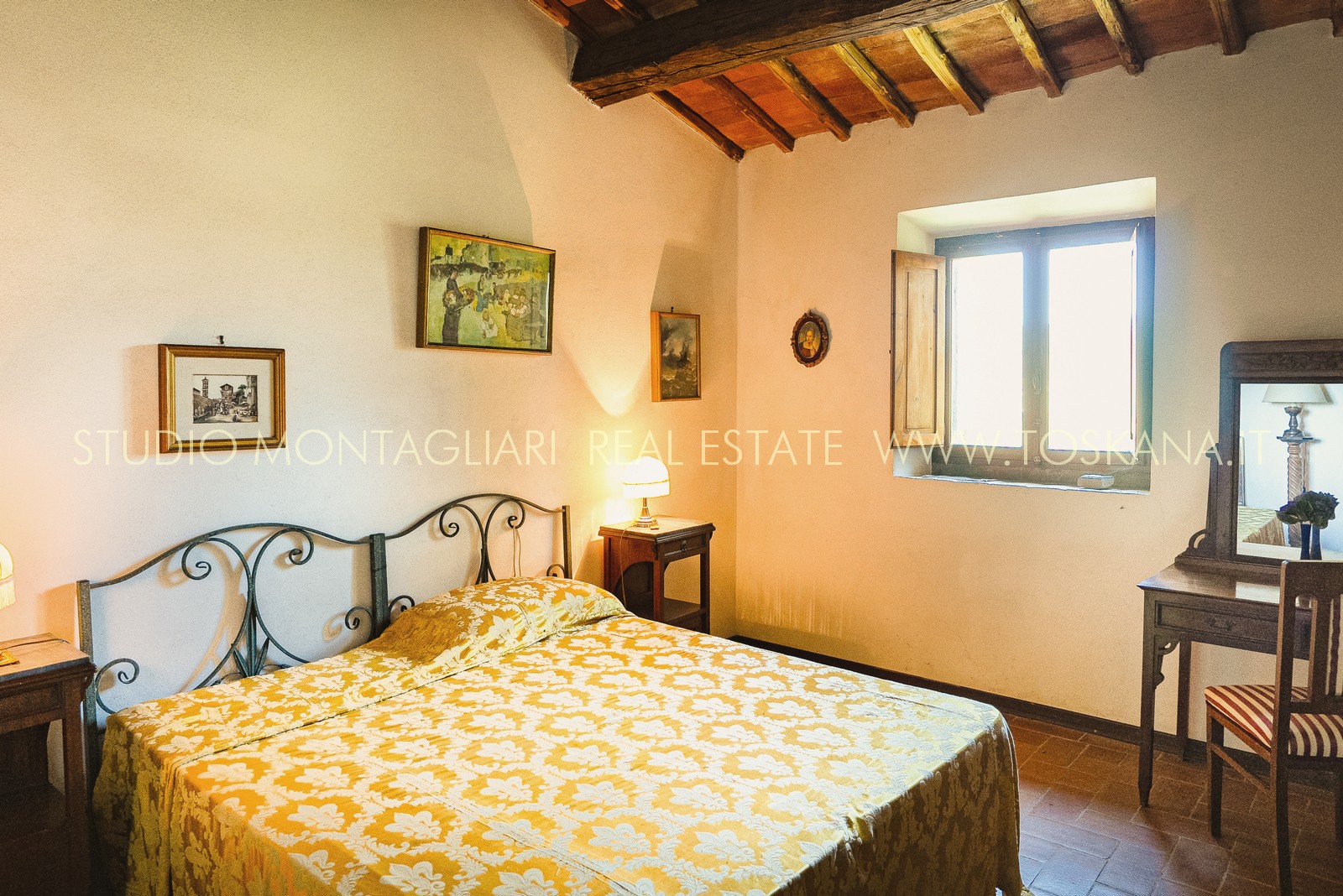 Sorge in cima di una collina e offre una magnifica vista sulla valle e sulle colline circostanti, compresi un paio di castelli della zona. Il casale, disposto su due piani, ha una superficie di 400 mq e offre ampie e confortevoli camere con soffitti con travi in legno e pavimenti in cotto. Al piano terra, con diverse aperture verso l'esterno, si trovano un ampio ingresso, una spaziosa cucina, una sala da pranzo con arco a vista e grande camino e uno studio o secondo soggiorno. Prosegue con una spaziosa camera da letto padronale con bagno en-suite e un bagno separato. Una scala interna, ma anche esterna, conduce al piano superiore, che comprende un altro ampio soggiorno con camino, 5 camere da letto, un bagno e un WC. Dal caratteristico portico e dalle scale esterne si accede a un piacevole giardino sul retro della casa, dove è possibile realizzare una piscina.
