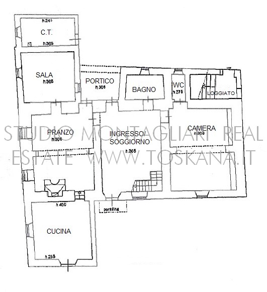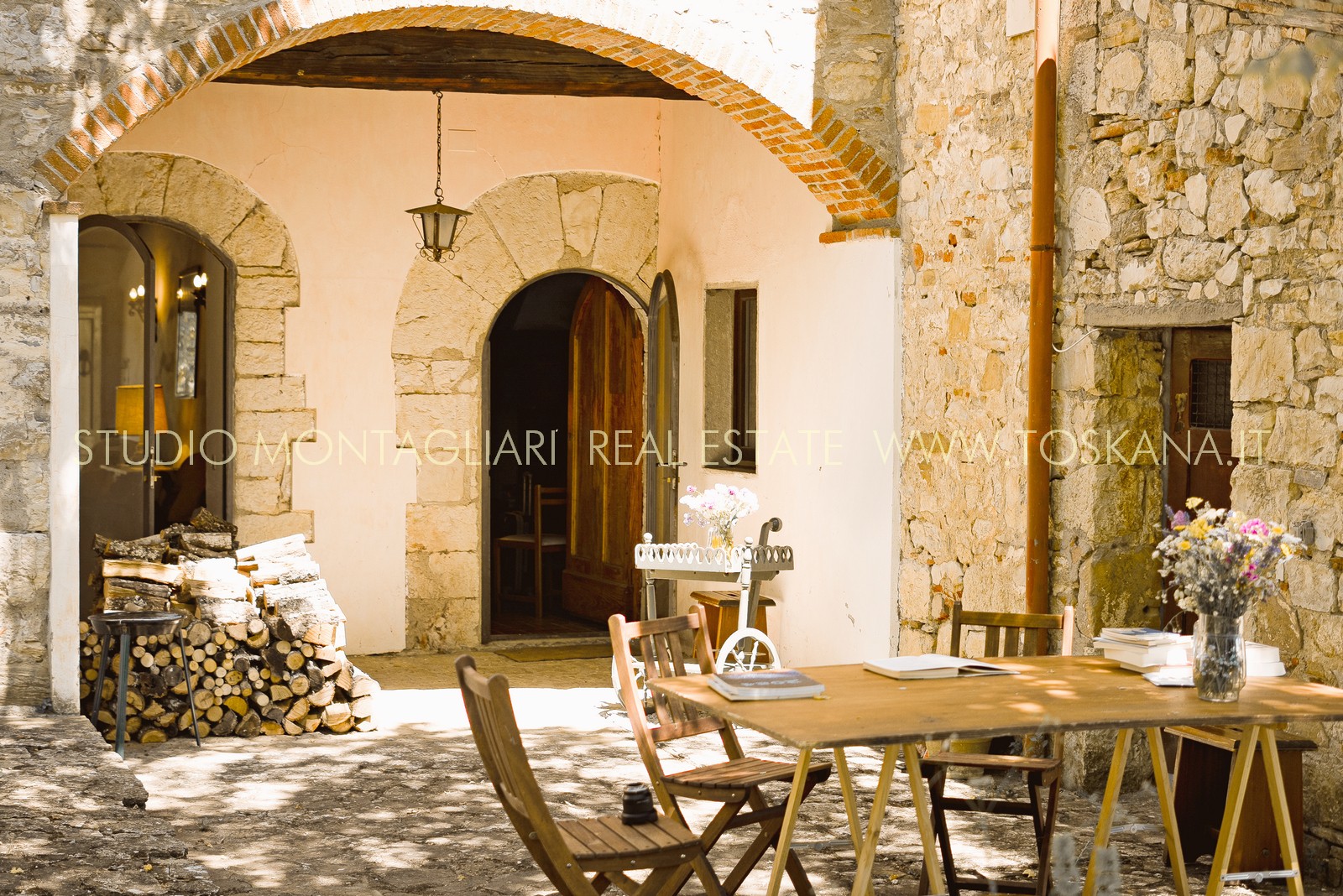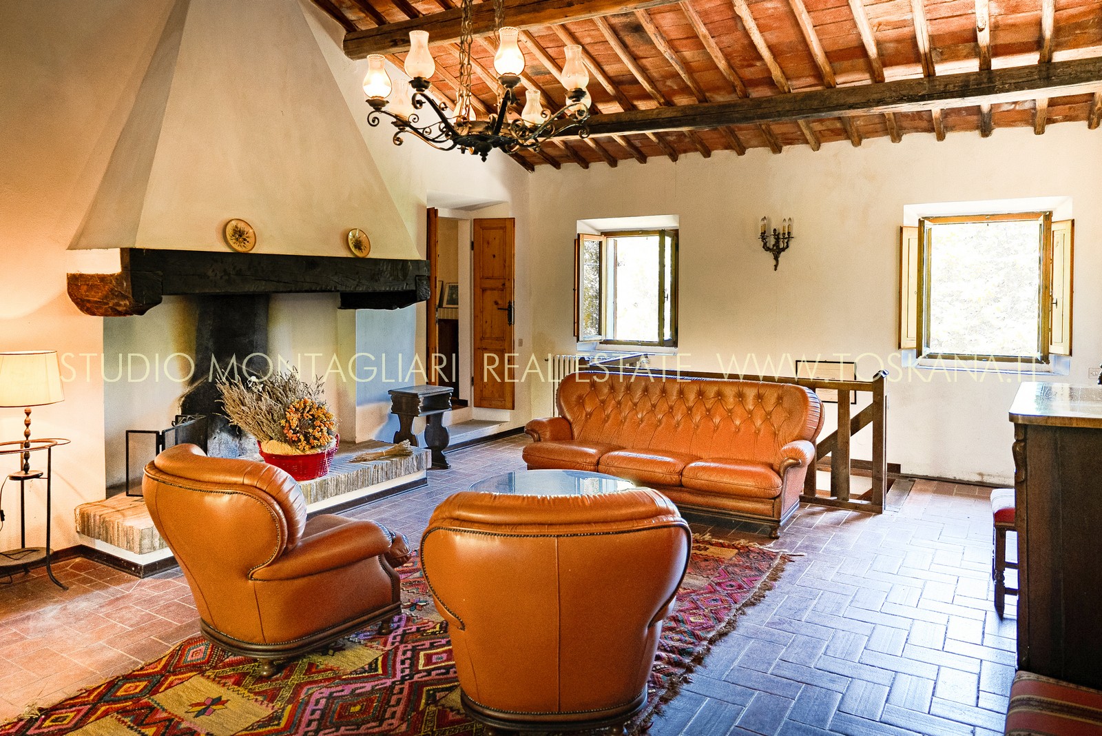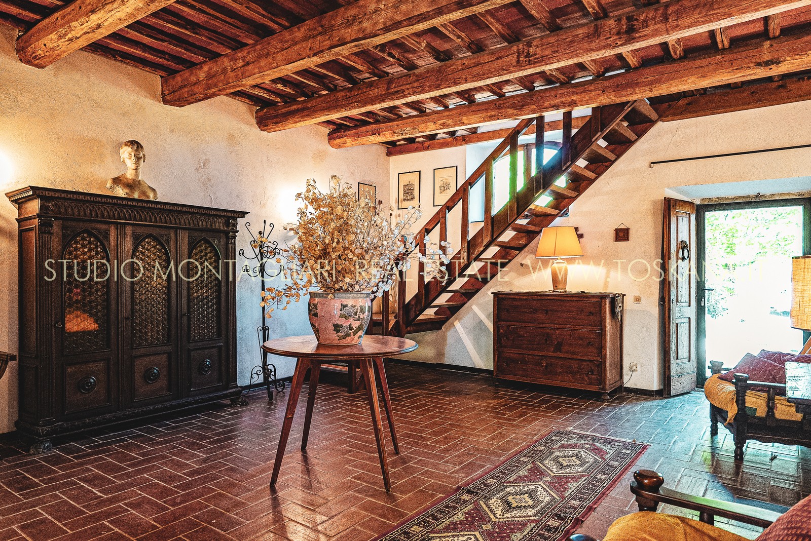 Sorge in cima di una collina e offre una magnifica vista sulla valle e sulle colline circostanti, compresi un paio di castelli della zona. Il casale, disposto su due piani, ha una superficie di 400 mq e offre ampie e confortevoli camere con soffitti con travi in legno e pavimenti in cotto. Al piano terra, con diverse aperture verso l'esterno, si trovano un ampio ingresso, una spaziosa cucina, una sala da pranzo con arco a vista e grande camino e uno studio o secondo soggiorno. Prosegue con una spaziosa camera da letto padronale con bagno en-suite e un bagno separato. Una scala interna, ma anche esterna, conduce al piano superiore, che comprende un altro ampio soggiorno con camino, 5 camere da letto, un bagno e un WC. Dal caratteristico portico e dalle scale esterne si accede a un piacevole giardino sul retro della casa, dove è possibile realizzare una piscina.