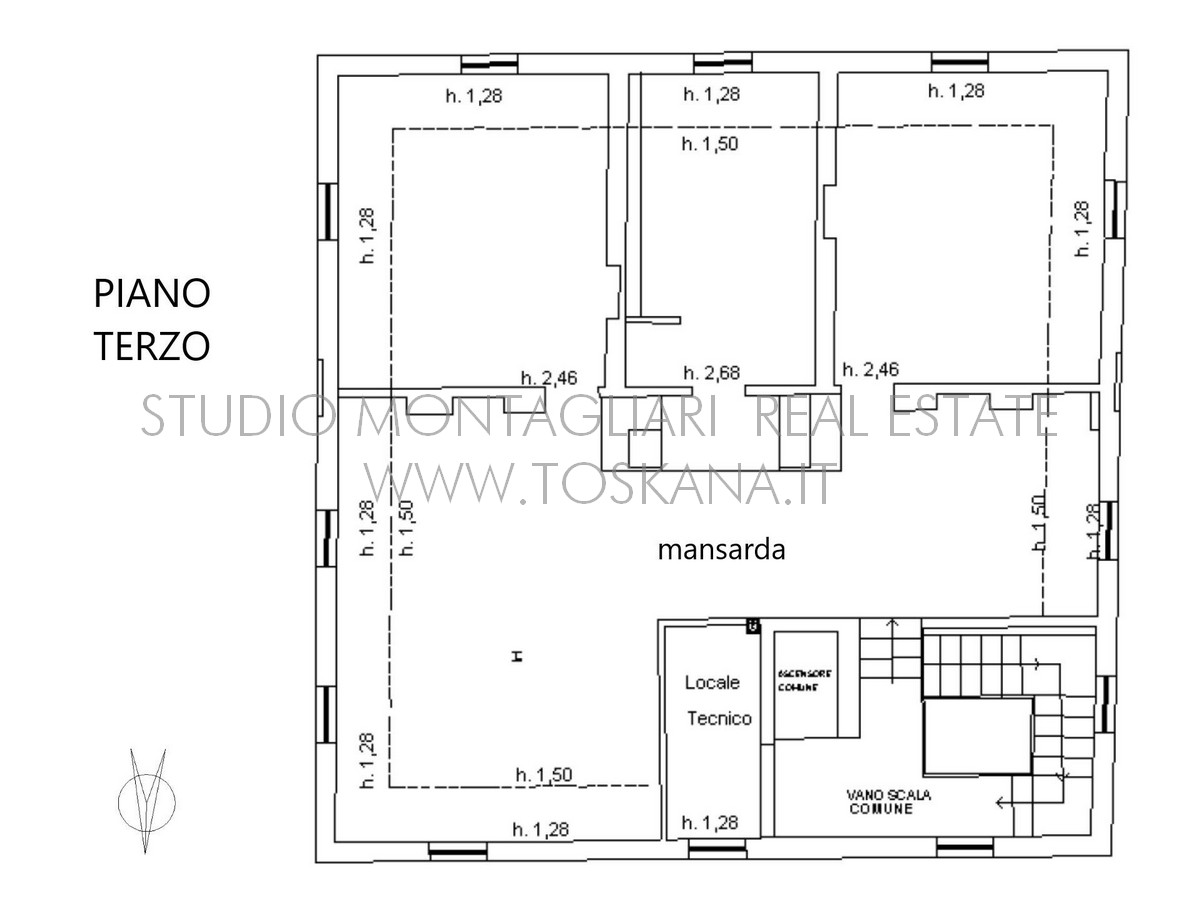 Ultimo piano di 124 mq, praticabile con un’altezza massima centrale di 2,68 mt., composta da un ampio vano con lucernario centrale e tre ambienti.