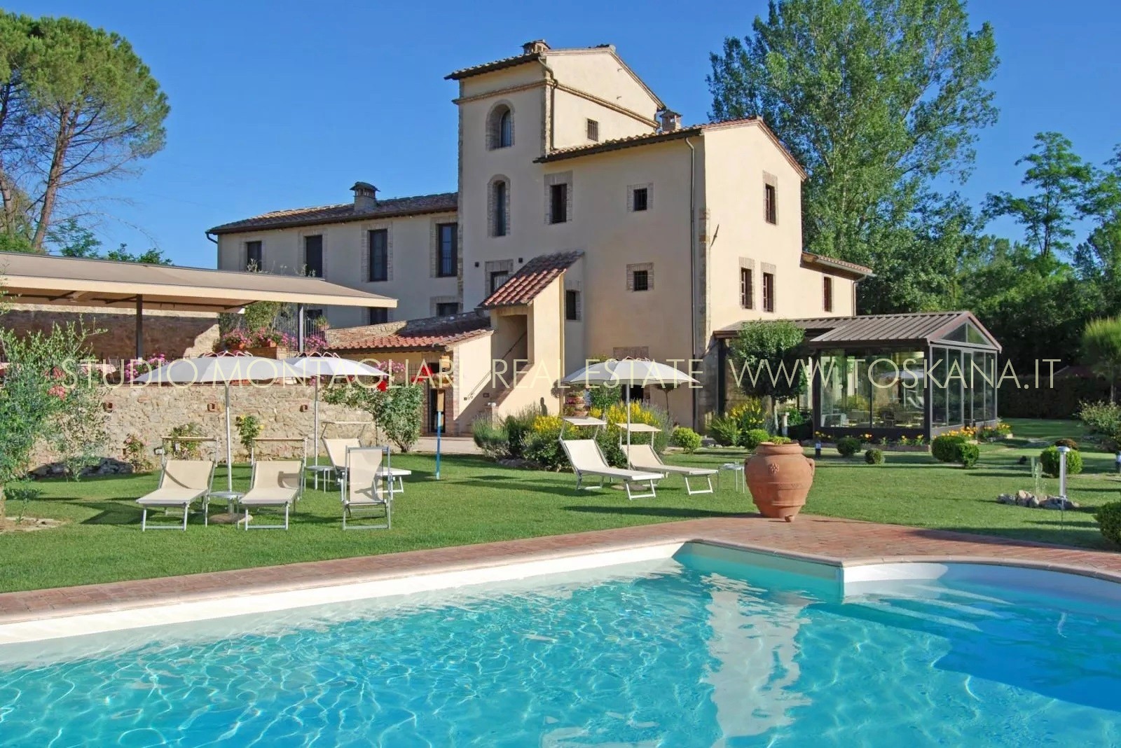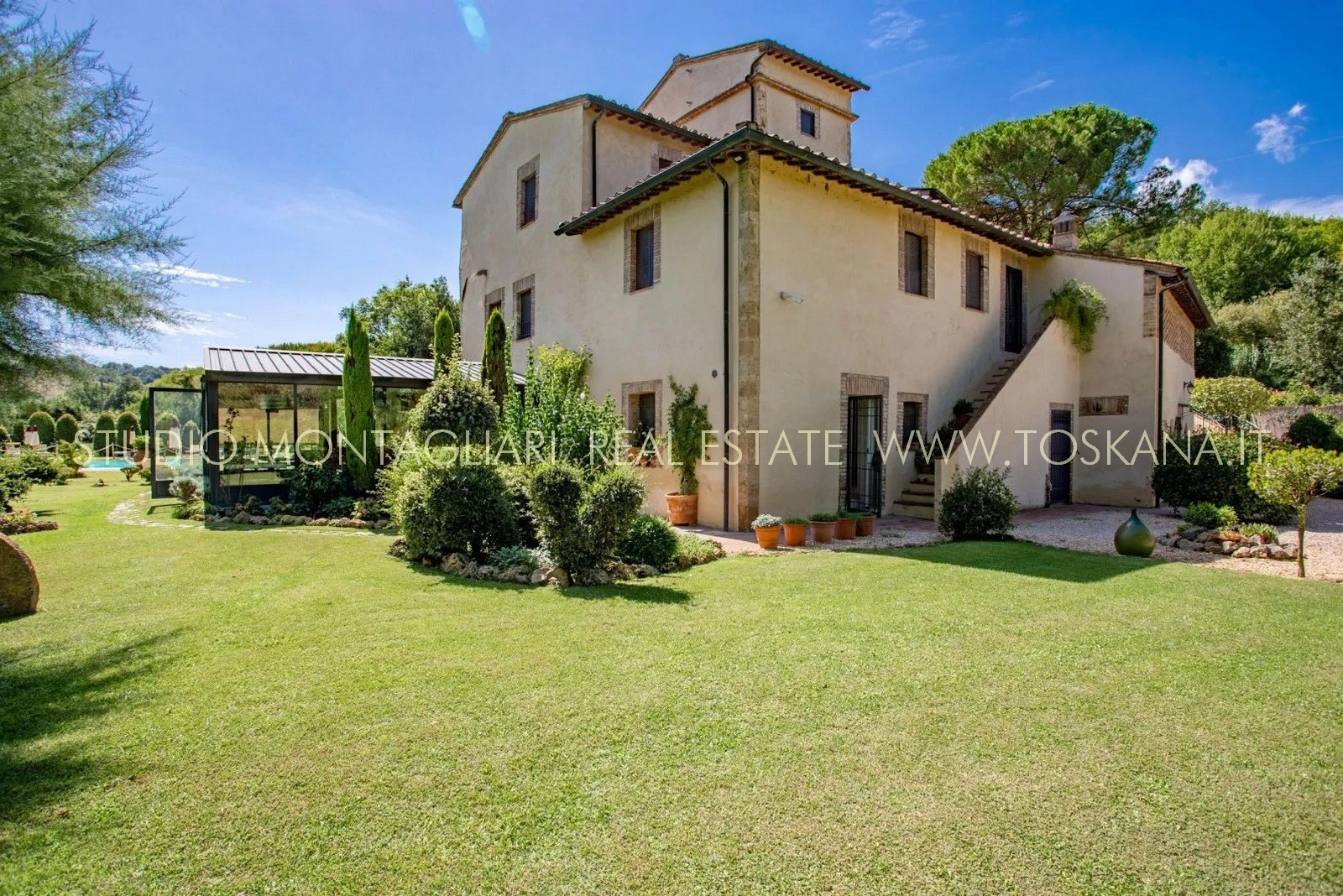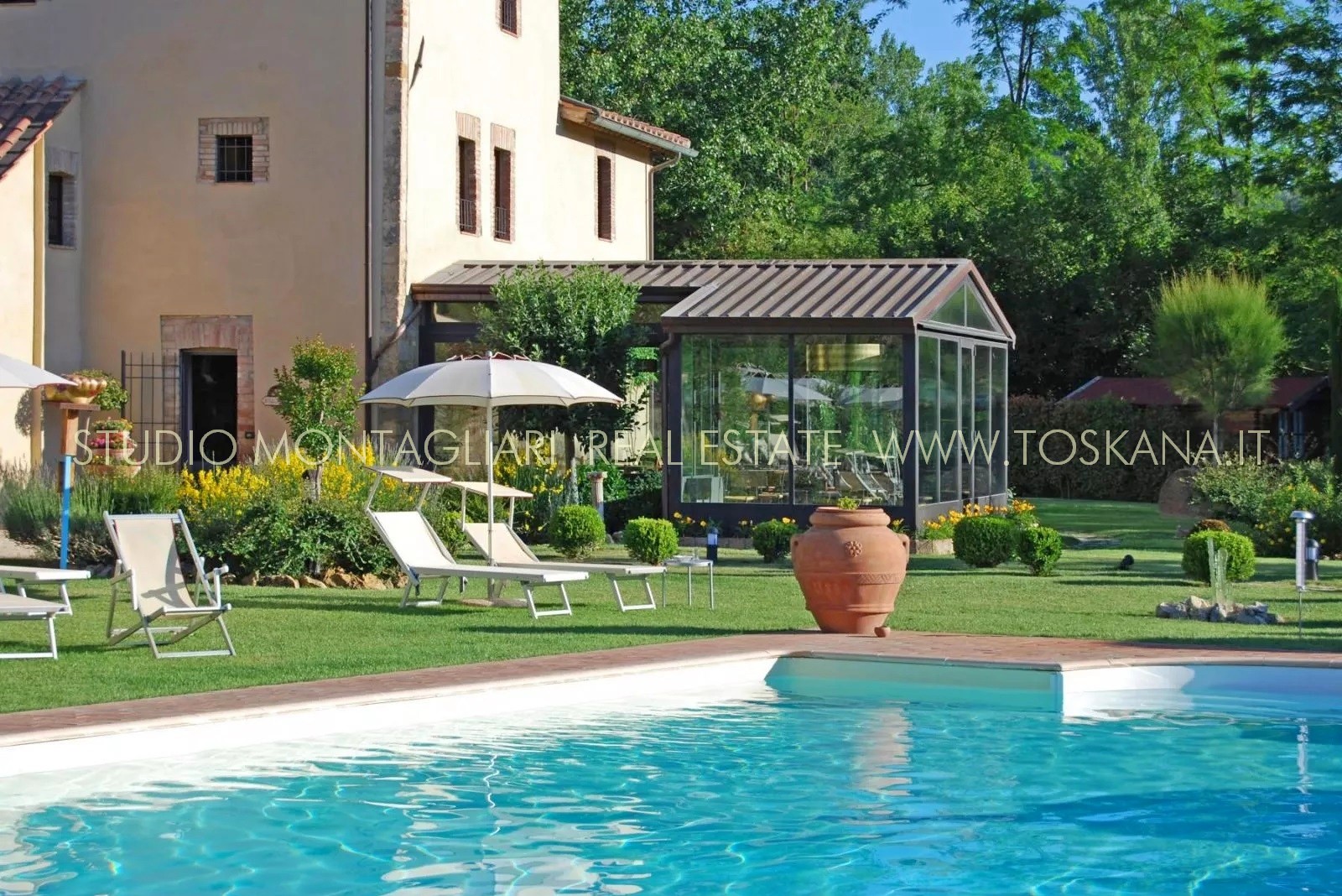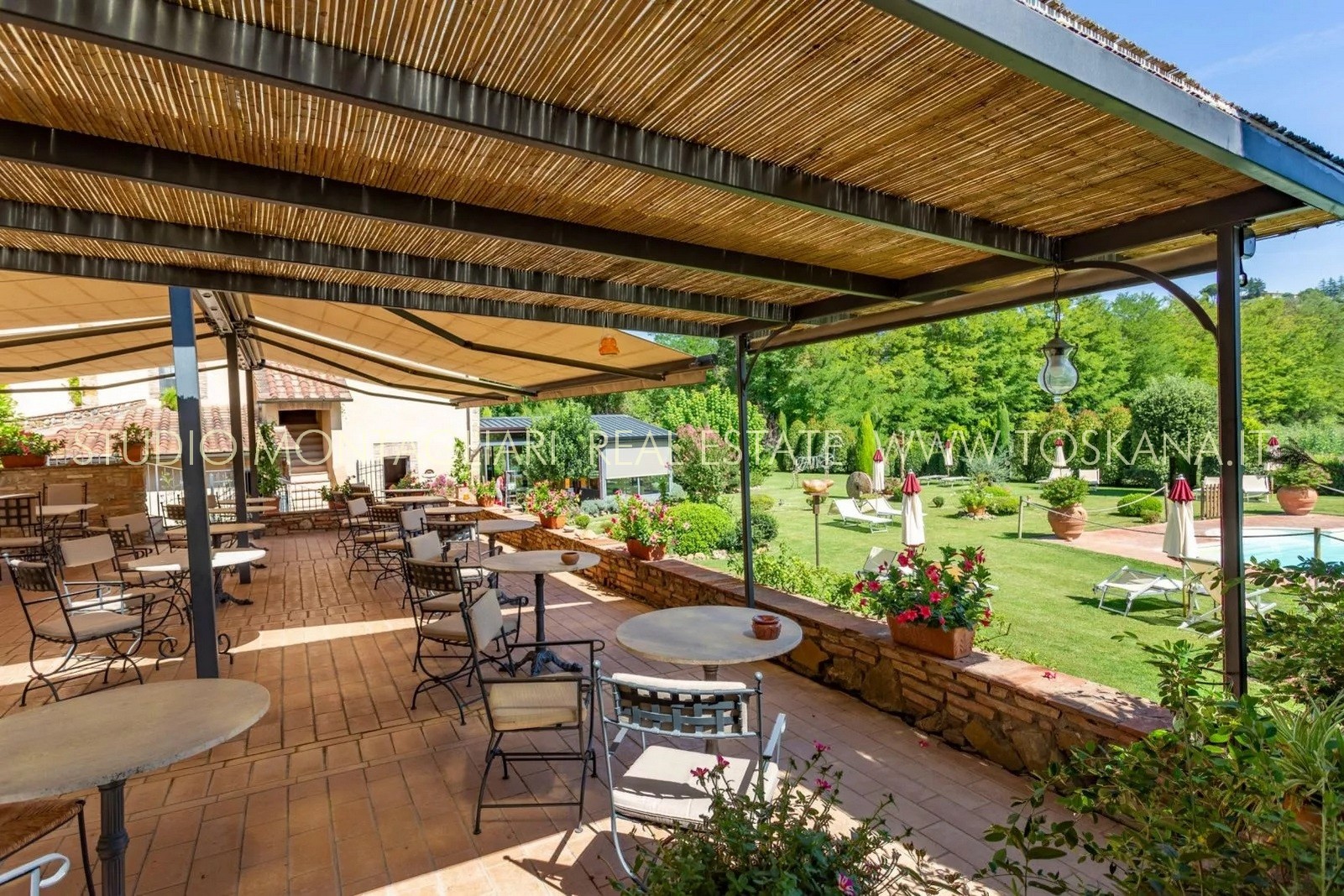 La proprietà è dotata inoltre di un'ampia terrazza coperta per il relax all'aperto e circondata da un giardino curato nel quale è inserita una piscina di 14 x 7 metri. Il verde potrebbe essere ulteriormente ampliato dato che il giardino confina con un totale di 5 ettari di terreno di proprietà.