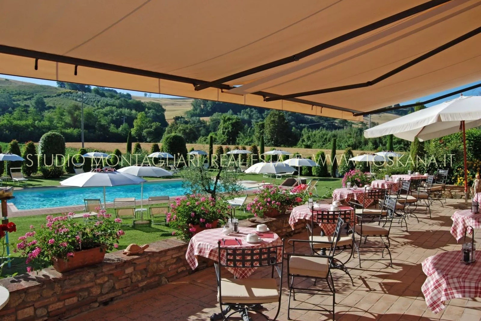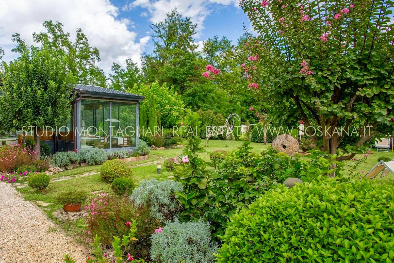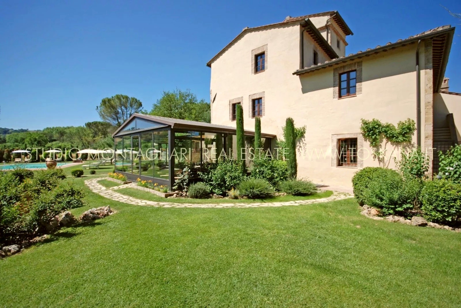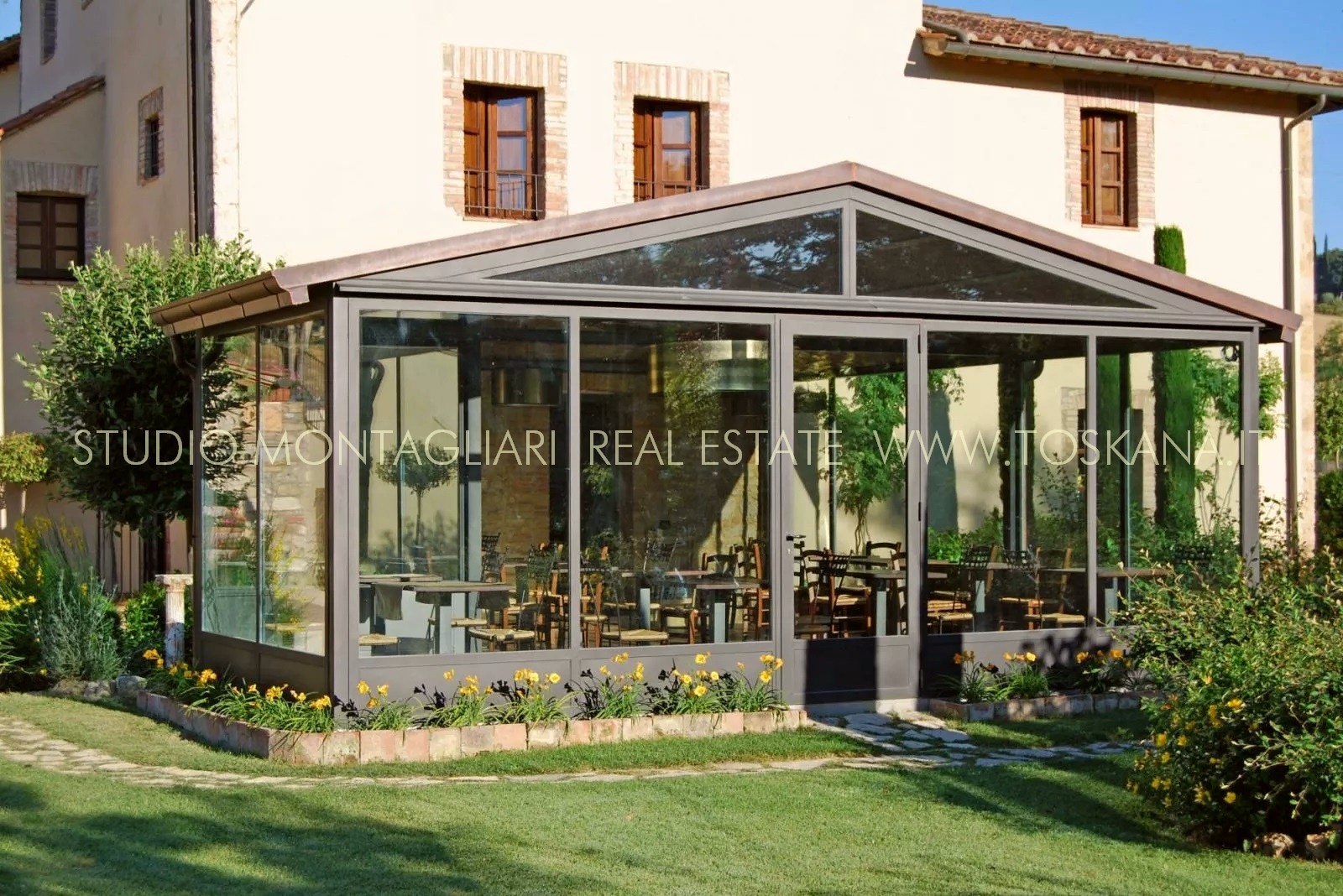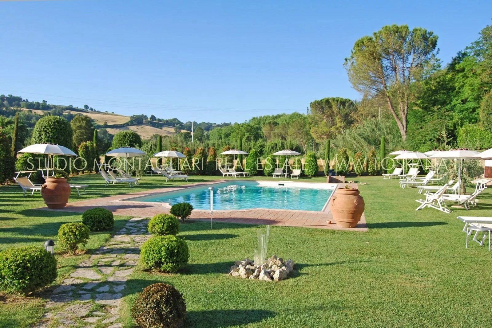 La proprietà è dotata inoltre di un'ampia terrazza coperta per il relax all'aperto e circondata da un giardino curato nel quale è inserita una piscina di 14 x 7 metri. Il verde potrebbe essere ulteriormente ampliato dato che il giardino confina con un totale di 5 ettari di terreno di proprietà.