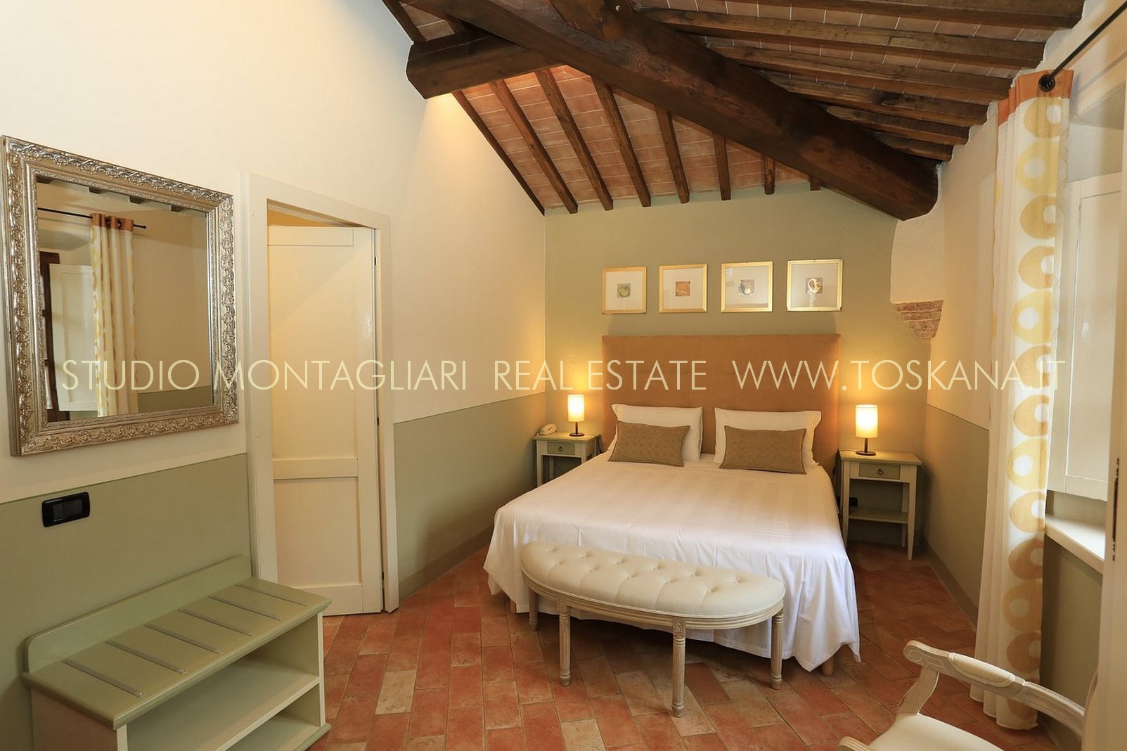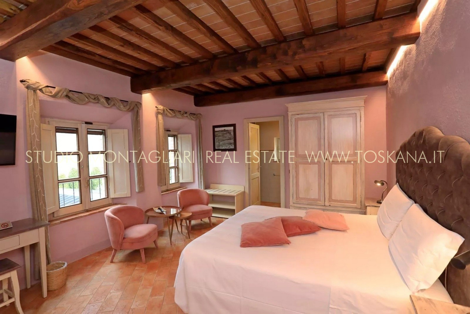 La superficie abitabile di circa 650 mq si sviluppa su tre livelli. L’hotel dispone di 16 camere e di 19 bagni. Ogni ambiente combina stile e comfort pratico, riflettendo l'eredità dell'edificio attraverso elementi quali travi in legno a vista, pavimenti in cotto e viste panoramiche sull'idilliaco paesaggio toscano. La veranda per la colazione con ampie vetrate permette agli ospiti di godere della vista sul verde curato e sulla piscina durante i pasti. La proprietà dispone inoltre di una cucina professionale, un' area lounge e un ufficio reception, garantendo al visitatore un'ospitalità impeccabile.
