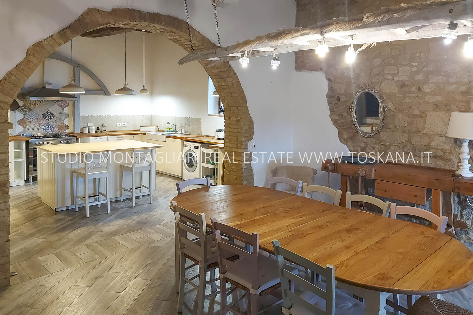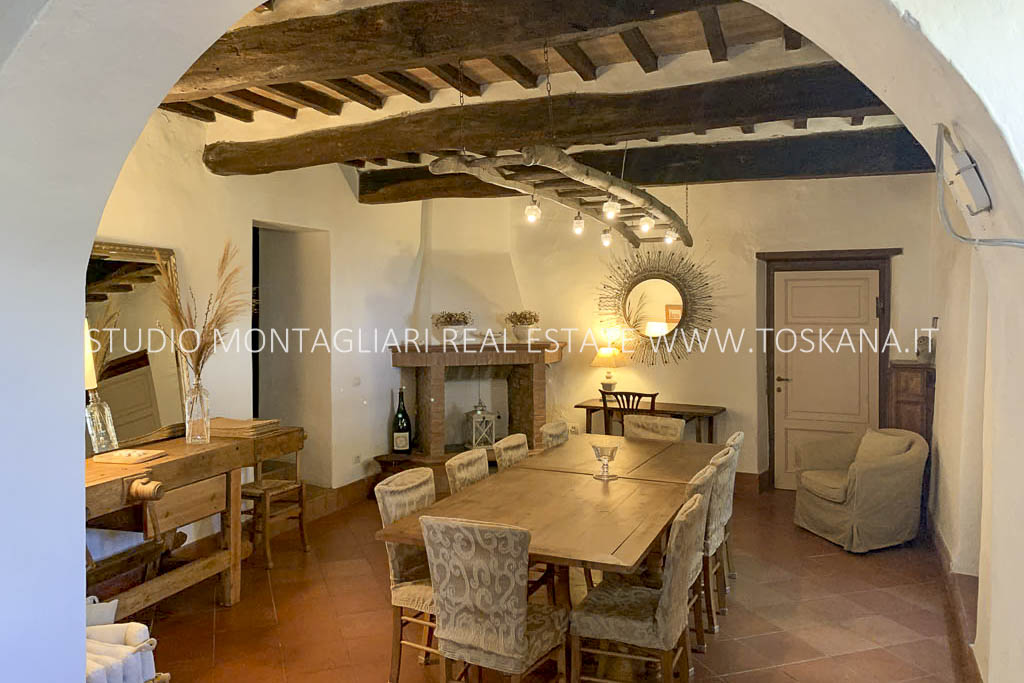 La proprietà, con una superficie di circa 540 mq, si sviluppa su due livelli e conserva affascinanti elementi storici, come i camini in pietra e l’antico forno, che creano un’atmosfera accogliente e raffinata. Il piano terra è composto da un ampio soggiorno con camino, un disimpegno con antico forno, una grande cucina, una sala da pranzo, un bagno di servizio e uno studio/camera da letto con bagno privato. Il primo piano ospita un elegante soggiorno con camino e 5 camere matrimoniali, tutte con bagno en suite, garantendo il massimo comfort e totale privacy. Inoltre, è presente una piccola cantina interrata, perfetta per vini e prodotti locali.