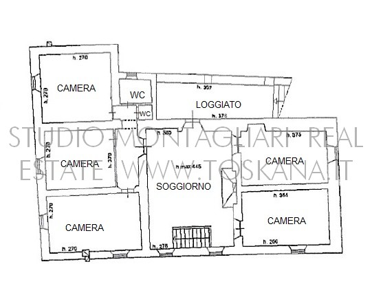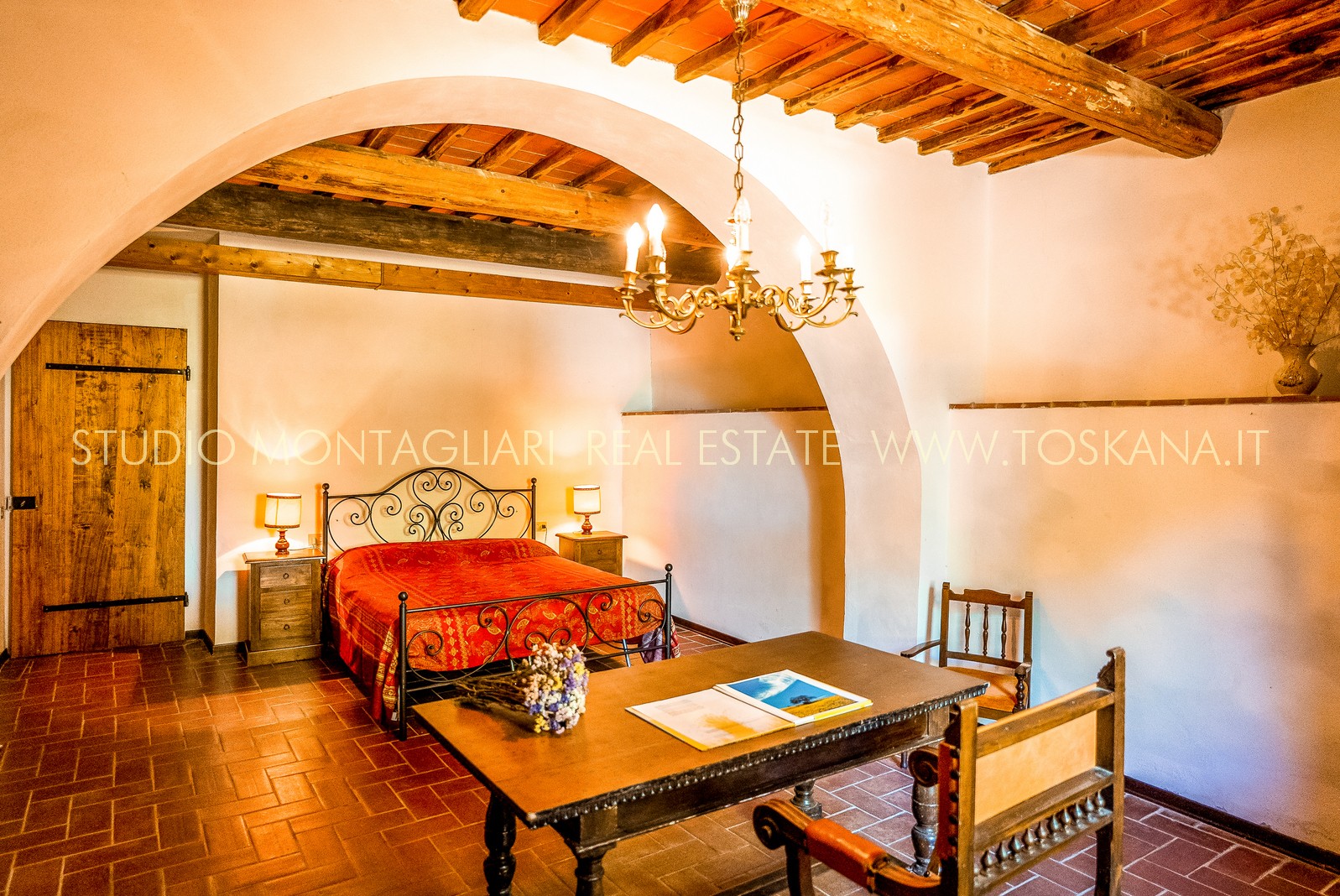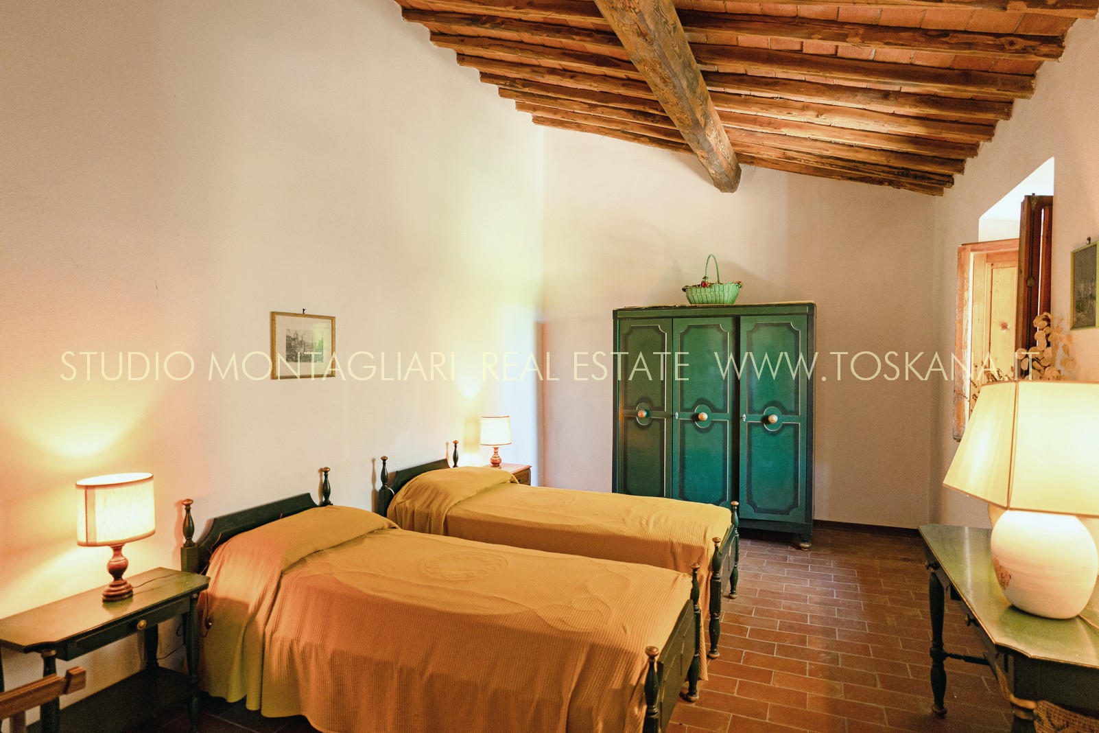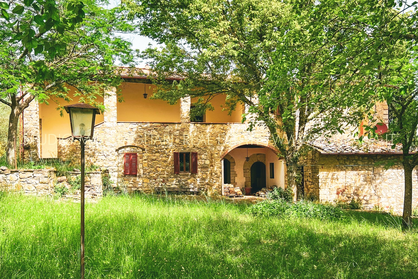 Sorge in cima di una collina e offre una magnifica vista sulla valle e sulle colline circostanti, compresi un paio di castelli della zona. Il casale, disposto su due piani, ha una superficie di 400 mq e offre ampie e confortevoli camere con soffitti con travi in legno e pavimenti in cotto. Al piano terra, con diverse aperture verso l'esterno, si trovano un ampio ingresso, una spaziosa cucina, una sala da pranzo con arco a vista e grande camino e uno studio o secondo soggiorno. Prosegue con una spaziosa camera da letto padronale con bagno en-suite e un bagno separato. Una scala interna, ma anche esterna, conduce al piano superiore, che comprende un altro ampio soggiorno con camino, 5 camere da letto, un bagno e un WC. Dal caratteristico portico e dalle scale esterne si accede a un piacevole giardino sul retro della casa, dove è possibile realizzare una piscina.