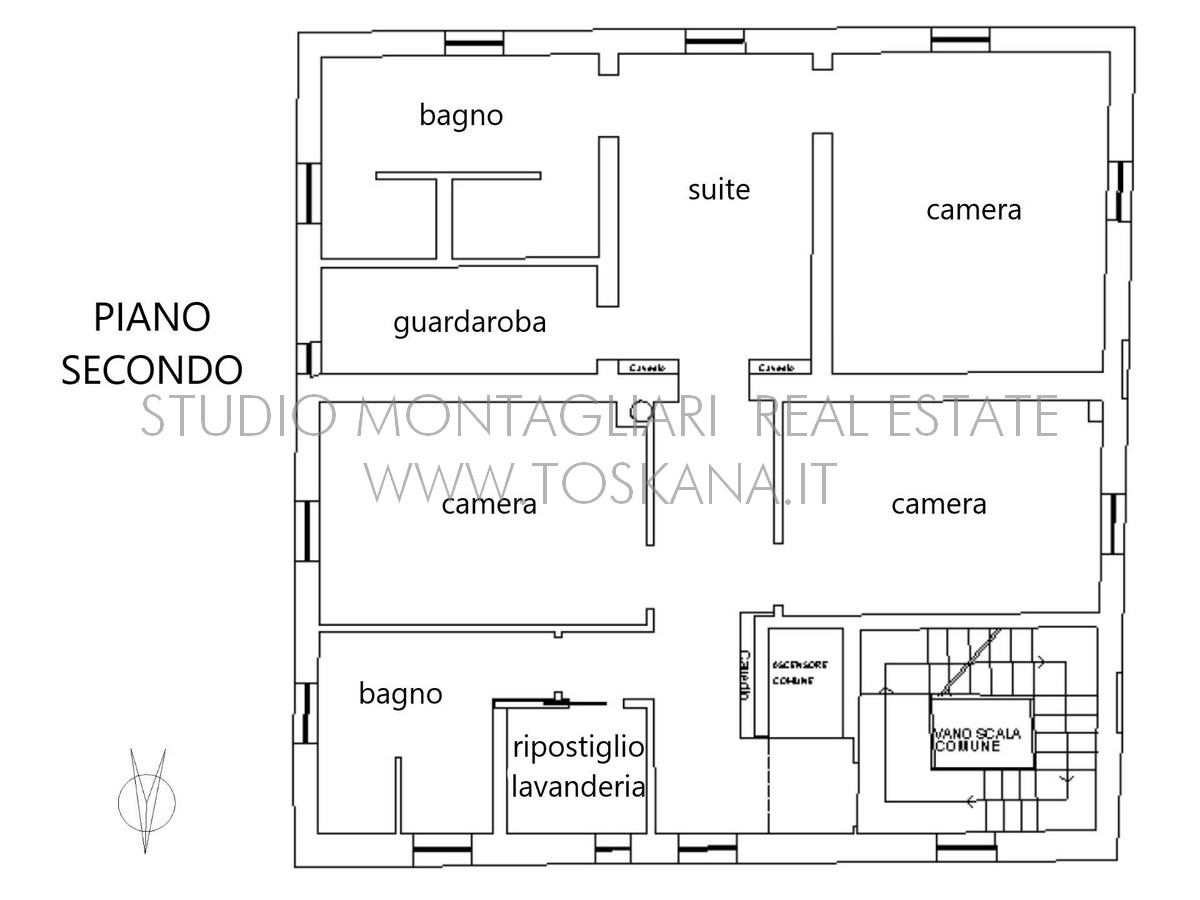Il piano secondo di 125 mq è composto da una suite padronale con camera, bagno con doccia e guardaroba, 2 camere doppie, un bagno con doccia ed un ripostiglio-lavanderia. Il primo e secondo piano (catastalmente due unità immobiliari), sono collegati internamente sia con l’ascensore che dall’antica scala in travertino suddivise con una netta distinzione fra la zona giorno e la zona notte.