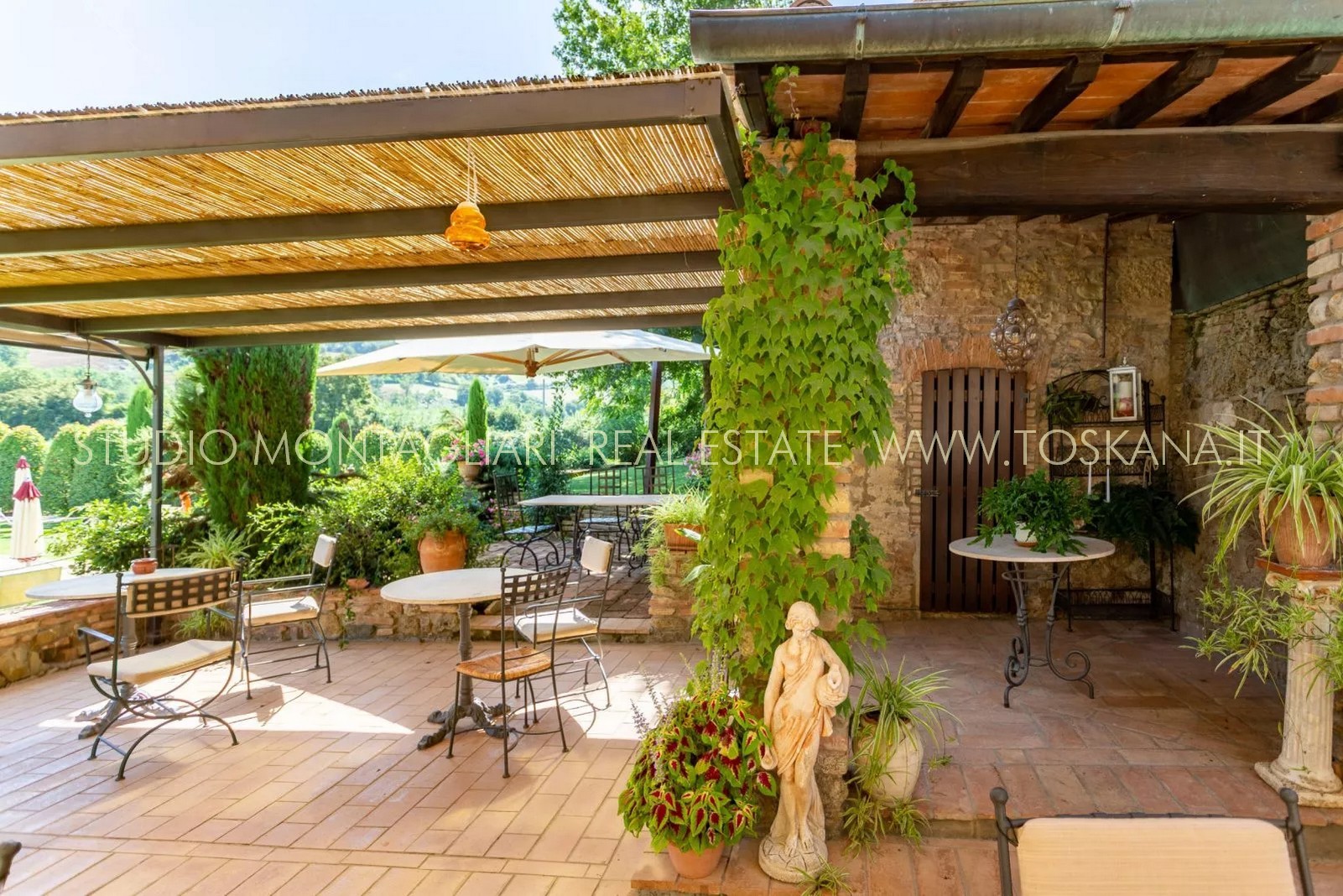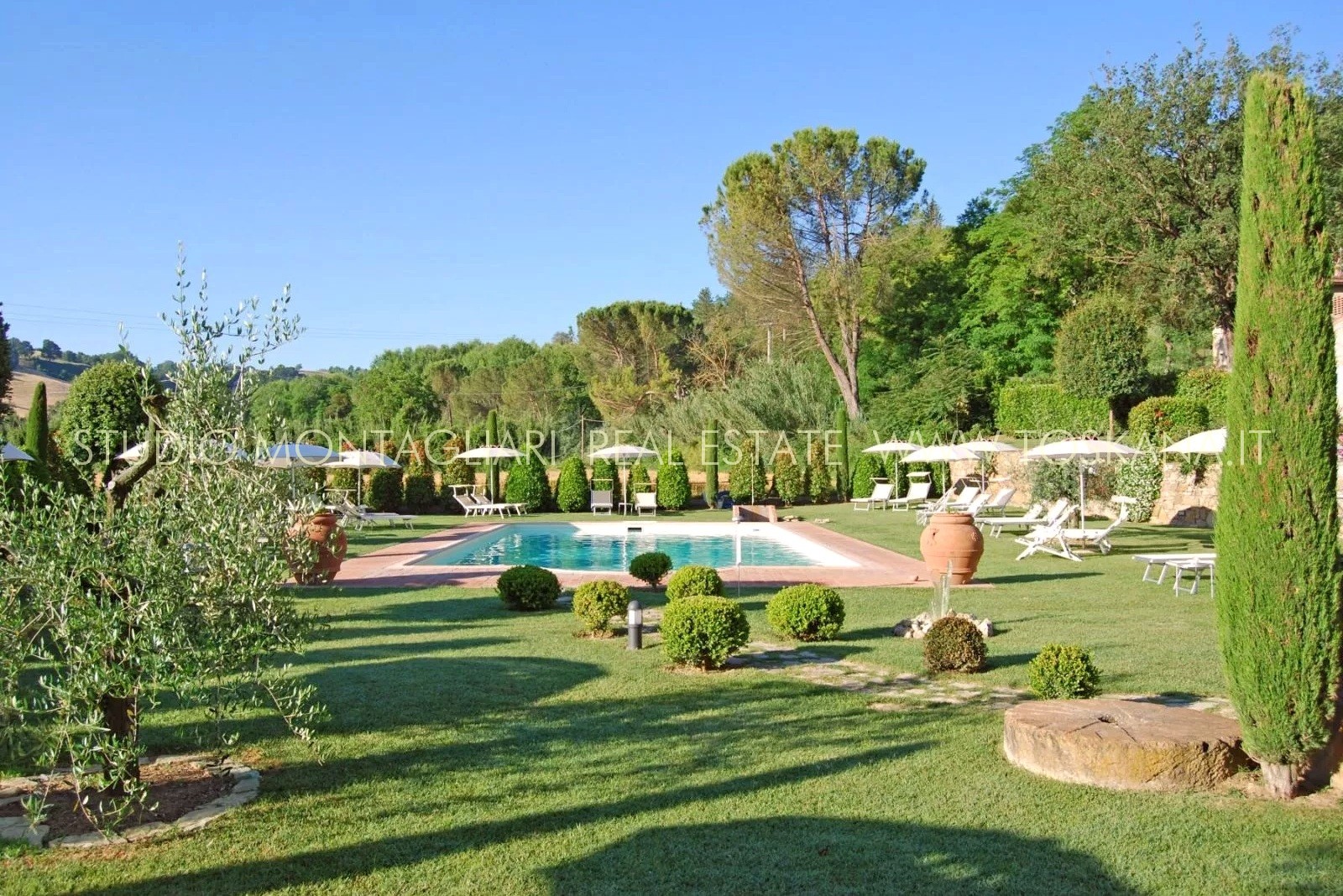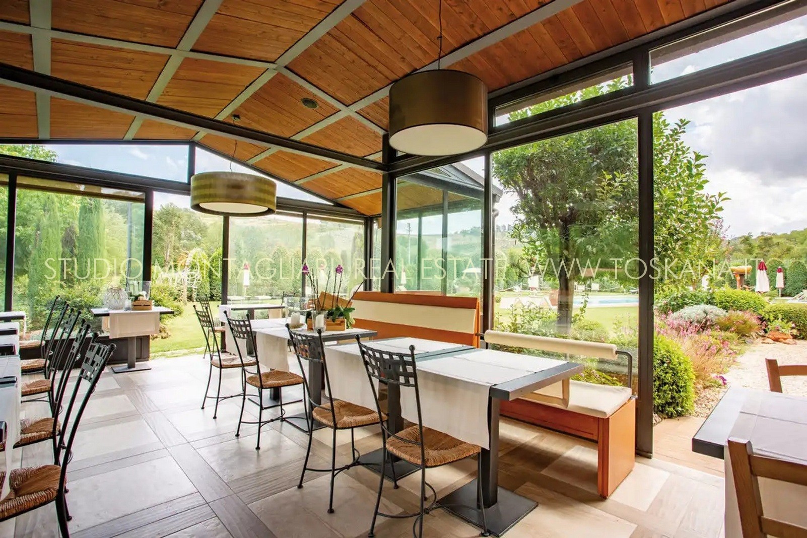 La proprietà è dotata inoltre di un'ampia terrazza coperta per il relax all'aperto e circondata da un giardino curato nel quale è inserita una piscina di 14 x 7 metri. Il verde potrebbe essere ulteriormente ampliato dato che il giardino confina con un totale di 5 ettari di terreno di proprietà.